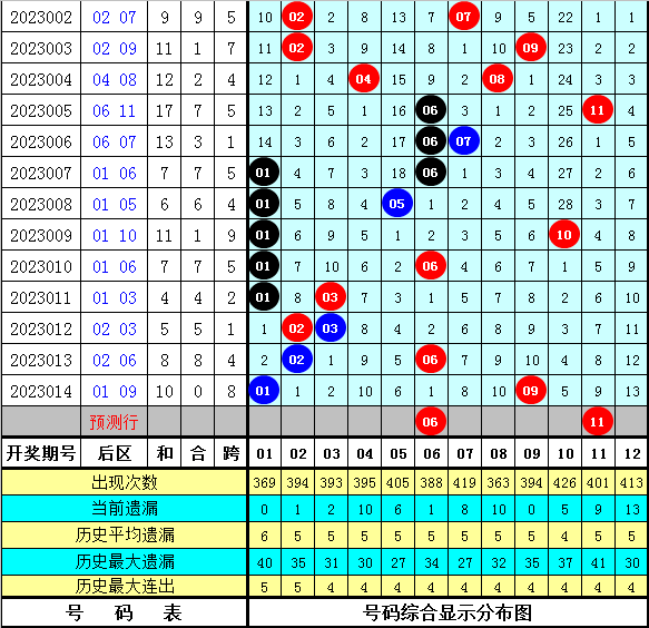 第2023015期后区奖号分析:后区最近五期开出奖号组合为:01+06、01+03、02+03、02+06、01+09,其中一奇一偶组合开出2次,全奇组合开出2次,全偶组合开出1次,本期后区关爱一奇一偶组合,参考号码06、11。