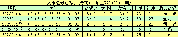 最近5期前区奇偶比划分开出3:2、3:2、2:3、4:1、1:4,奇偶比总比例为13:12,奇偶号码走势基本至极,本期预测奇数号码走大,奇偶比参考3:2。