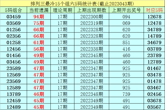 (4)胪列三第2023043期遗漏值最大的十个5码组六组合解冻了2个;