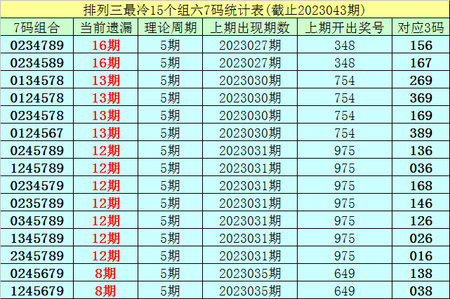 (1)在胪列三已开出的6464期奖号中(统计适度第2023043期),现在7码组六遗漏值最大的组合为:0234789、0234589,本期遗漏16期;