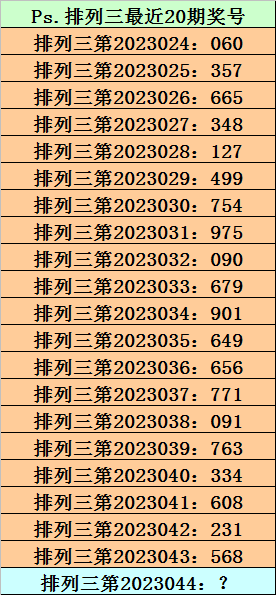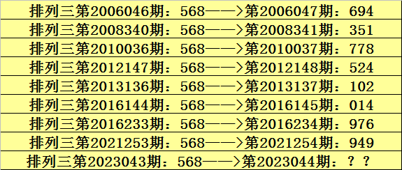 第2023043期胪列三奖号为568,历史上该号码直选出现9次,下期奖号分裂为:694、351、778、524、102、014、976、949。