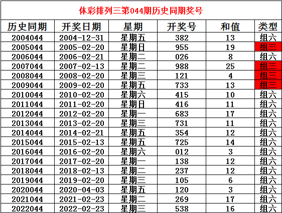 2023年2月23日摆设三第044期开奖,历史同技艺别开出奖号: