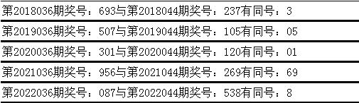 与前期历史同时奖号对比分析,在最近五年开奖中,第036期同时奖号与第044期同时奖号皆出现了疏通号码: