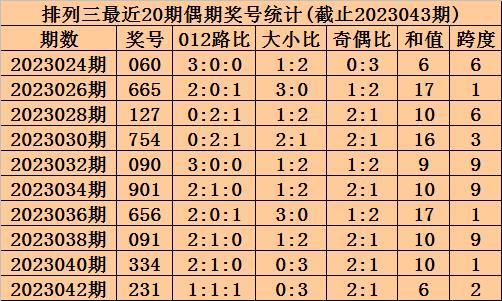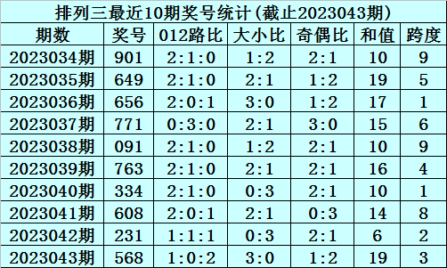 上期回来:摆设三2023043期奖号为568,奇偶比为1:2,大小比为3:0,跨度为19。